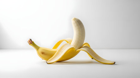 One peeled banana partially revealed on a white background, minimalist aesthetic, food detail focus