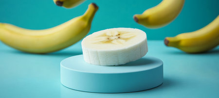Ripe Banana Slice on a Blue Podium with Whole Bananas in the Background on a Blue Surface