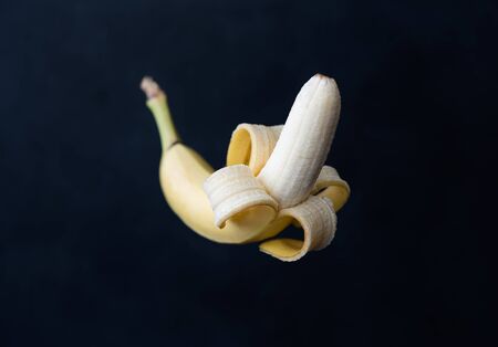 Top up view isolated fresh yellow banana isolated on dark table. added copy space for text.