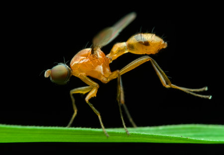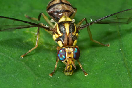 Close-up Stilt-legged fly on green leaf, Beautiful macro shot of Micropezidae.