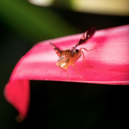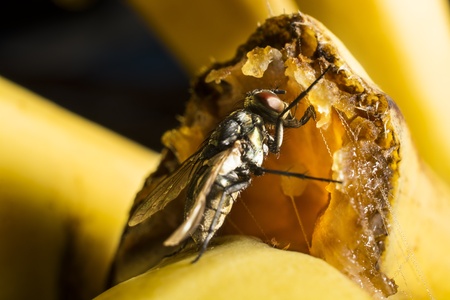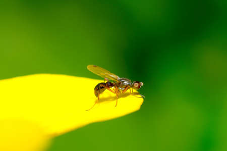 A macro photograph of a fly on a bright yellow background. The fly is in focus, and its wings are spread out. The background is a solid color, which makes the fly stand out.