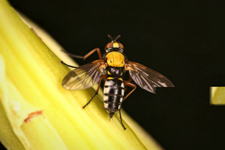 A macro photograph captures a detailed view of a fly with striking yellow and black markings perched on a vibrant green plant stem against a dark background.