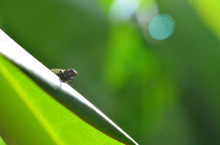 A fly giant-sized animal insect with wings standing alone on the natural green leaf.