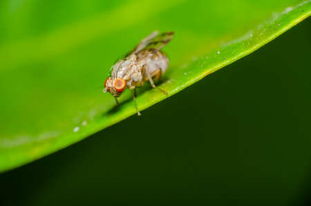 Close up details of large common fly sitting on green leaf with nature blurred background.