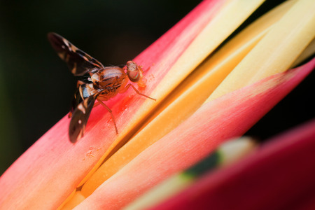 An orange-red fly perched on a tree branch. The background is black shadow. Close-up macro shot.