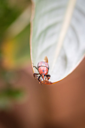 Close up Drosophila Melanogaster or fruit flies on green leaf in garden.