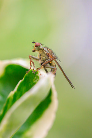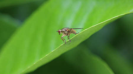 Closeup of a Scathophaga stercoraria insect, also known as the yellow dung fly or the golden dung fly, resting on a green leaf