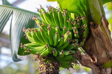 A bunch of green bananas hanging from a tree. The bananas are ripe and ready to be picked