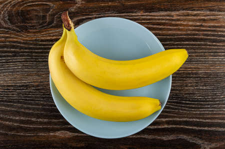 Two ripe fresh bananas in glass blue plate on dark wooden table. Top view
