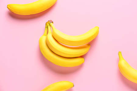 Colorful fruit pattern of fresh yellow bananas on pink and blue background. From top view