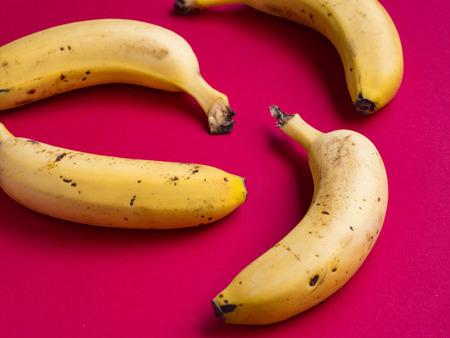 Top view of ripe yellow banana on a pink background, minimal style