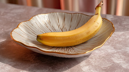 A vibrant yellow banana rests on an intricately designed decorative plate, capturing the essence of simplicity and elegance in natural light.