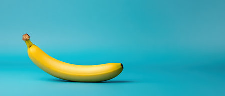 A single ripe banana is placed against a vibrant turquoise background showcasing its color and smooth texture clearly.