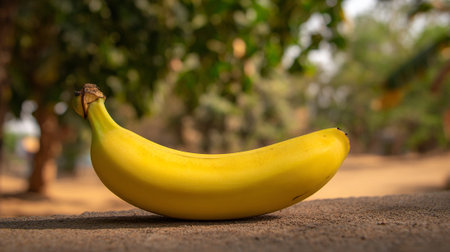 Ripe yellow banana resting outdoors with soft bokeh background creates a vibrant scene.