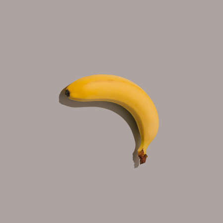 Yellow banana on a grey background. Playful minimal food concept. Unique abstract flat lay idea.