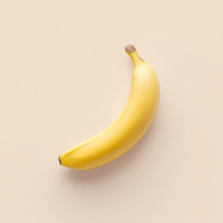 A single ripe banana rests against a soft background, perfect for showcasing a healthy snack or fruit theme in your designs and projects.