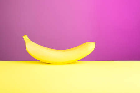 bright ripe yellow banana on yellow table, background purple