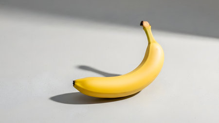 Artistic overhead shot of a single banana with dramatic lighting and subtle shadow, on seamless white backdrop