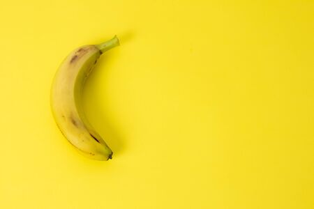 Monochrome yellow concept. One single fresh ripe banana in peel on yellow background. Top view