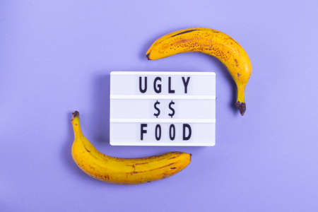 Inscription ugly food on a purple background with ugly bananas with defects