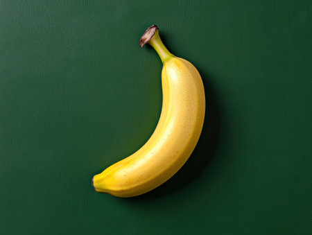 Single ripe yellow banana on a dark green background
