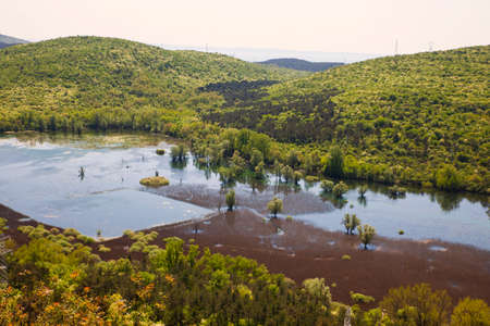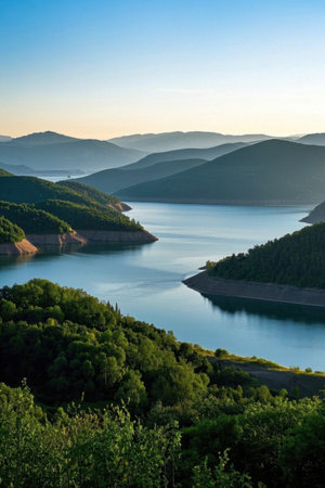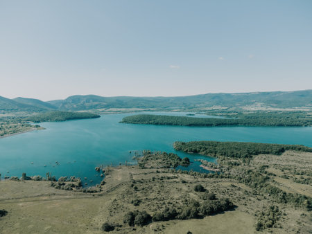 Aerial view on mountain lake. Drone over water reservoir at mountain valley covered with green spring forest. Beautiful view from above on smooth blue surface of mountain lake among highlands. Nobody