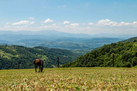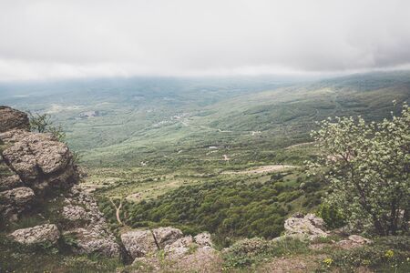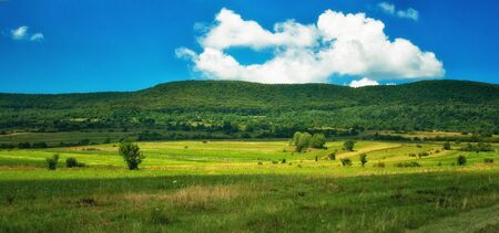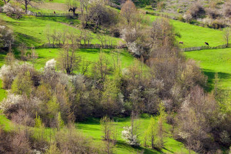 Panoramic view of mountains valley. Green fields and trees in spring on a sunny day. View from above. Zakarpattia Oblast, Ukraine, Europe