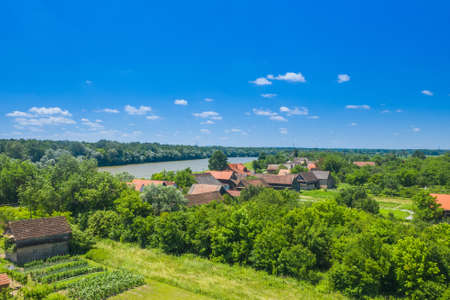 Traditional village of Drenov Bok nature park Lonjsko polje, Croatia, aerial view
