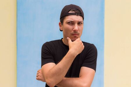 Portrait of stylish handsome caucasian man fashion model in t shirt and cap, studio shot.