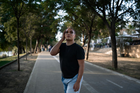 A portrait of a modern man, exuding confidence and style, against an outdoor backdrop, showcasing his charisma and fashionable demeanor.