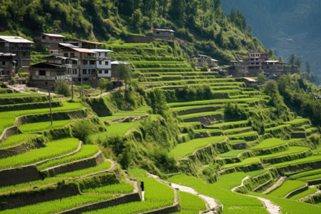 rows of vegetable patches in a terraced mountain village, created with generative ai