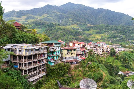 Colorful chaotic buildings in front of the rise terraces Banaue, Philippines