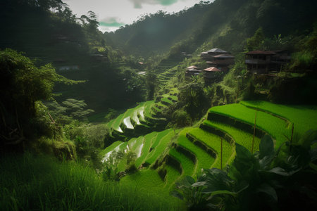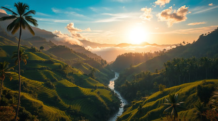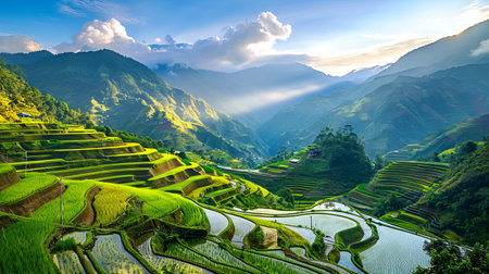 Sun rays piercing through the peaks onto the lush terraced rice paddies in a majestic mountainous landscape during early morning.