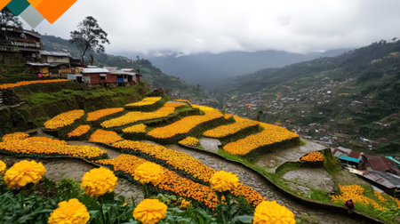 Discover a breathtaking view of vibrant yellow flower fields on terraced landscapes, situated in a mountainous region, framed by a dramatic cloudy sky.