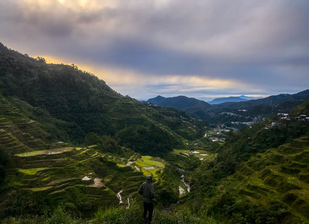 Sunset in the rice field terraces in the area of batad, in Philippines