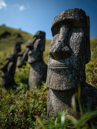 This image features three stone statues, each with a distinct carved face, situated amidst vibrant green vegetation on a hillside. The statues exhibit a weathered texture, and their dark gray coloration contrasts with the vivid green and blue. The composition suggests an outdoor setting, likely during daylight, offering potential uses for editorial and illustrative content.