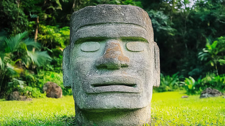 Mysterious stone heads in lush jungle