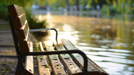 A close-up of an old wooden park bench bathed in golden sunlight. The scene is peaceful, with soft focus in the background creating a relaxing and serene atmosphere in nature.