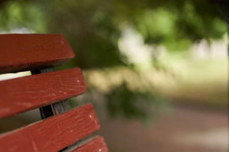 Empty Park wooden bench Closeup view. Wood exterior material. Wo