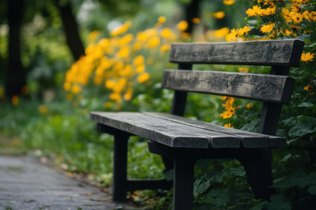 Wooden bench in a quiet garden setting, surrounded by hedges and fallen leaves, offering a place for rest and contemplation