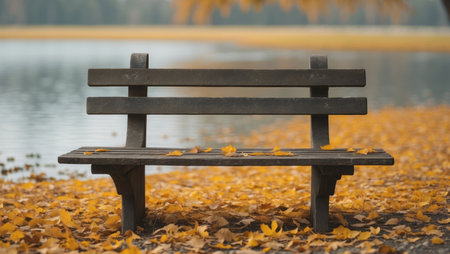 AI Generated. Empty wooden bench by a lake surrounded by yellow leaves