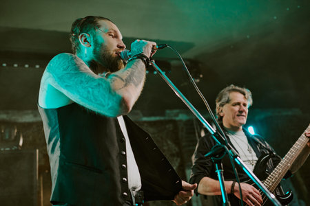 Low angle view of two gen X Caucasian men singing into microphone and playing bass on stage in nightclub