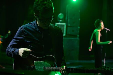Guitarist playing on electric guitar at live concert in the night club