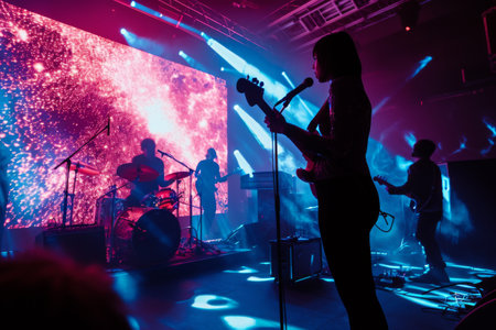 Energetic rock band performing under dramatic stage lights with glowing silhouettes.