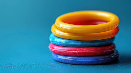 Colorful plastic rings on a blue background. Selective focus.
