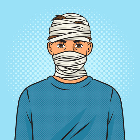 wounded injured man with bandaged head pinup pop art retro vector illustration. Comic book style imitation.