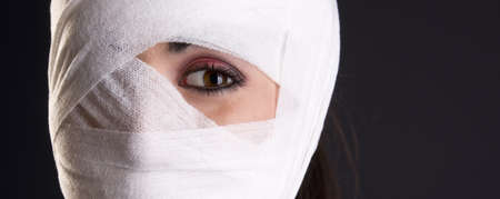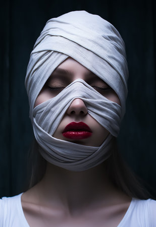 glamorous image for halloween.female face wrapped in bandage.beautiful girls lips.beauty make-up woman.plastic surgery