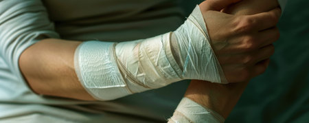 Bandaged arm close-up after medical procedure, showcasing detailed white bandages and gentle lighting