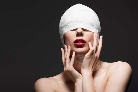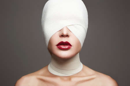 woman face wrapped in bandage. beautiful girls red lips. plastic surgery concept
