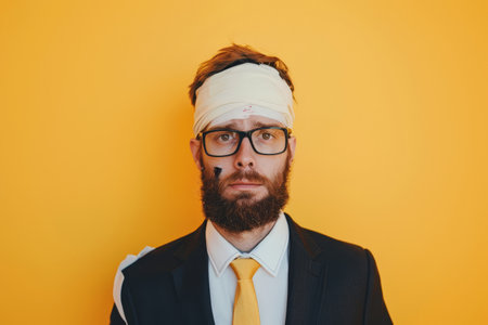 A man with a bandage on his head looks seriously at the camera while dressed in formal attire, set against a vibrant yellow background.
